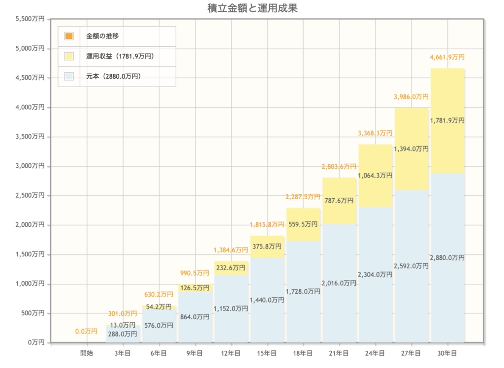 毎月8万円の積み立てを30年間行なった場合、元本が2880万円に対し