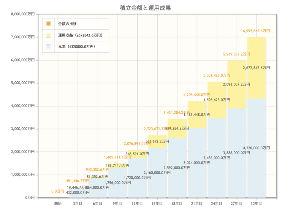 これら2つのグラフは想定利回り3%と5%で月1万2000円を30年間積み立てた時のものです。